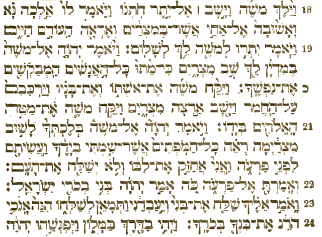 The presented below example text of the Book of Exodus 4,18–23 from the Hebrew Bible shows the manner of recording of the God’s Revelation, the manner used by the inspired writers about six centures before the birth of Christ. In the text there are also visible Arabic numerals and Latin letters, introduced by contemporary publisher.